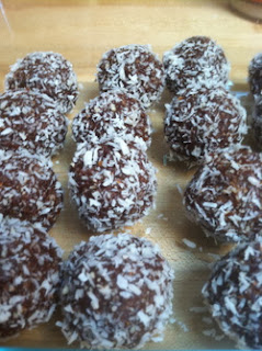 Put 1/4 cup coconut flakes, nuts, cocoa powder in food processor and process with "s" blade until coarsely mixed. Add almond extract, raw coconut, dates, and raisins. Process until mixture holds together when gently rolled between your fingers. Form into balls and then roll in 1/4 cup coconut flakes. These are amazing no-bake donut holes! Enjoy and live healthy! Share with friends!